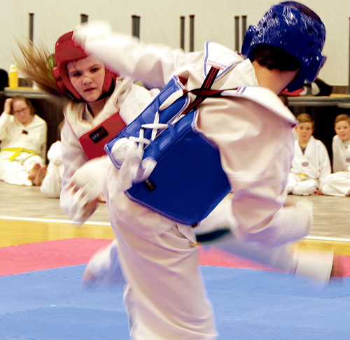 After taking a moment to visualize and focus, followed by a loud kihap, Champion Taekwondo instructor Blaine Sherring powers through four bricks with a palm strike on Saturday, April 11 at the Champion Collective in Provost. Five students challenged their black belt tests. See more photos in The Provost News dated April 15, 2026. ©Provost News Photo. |